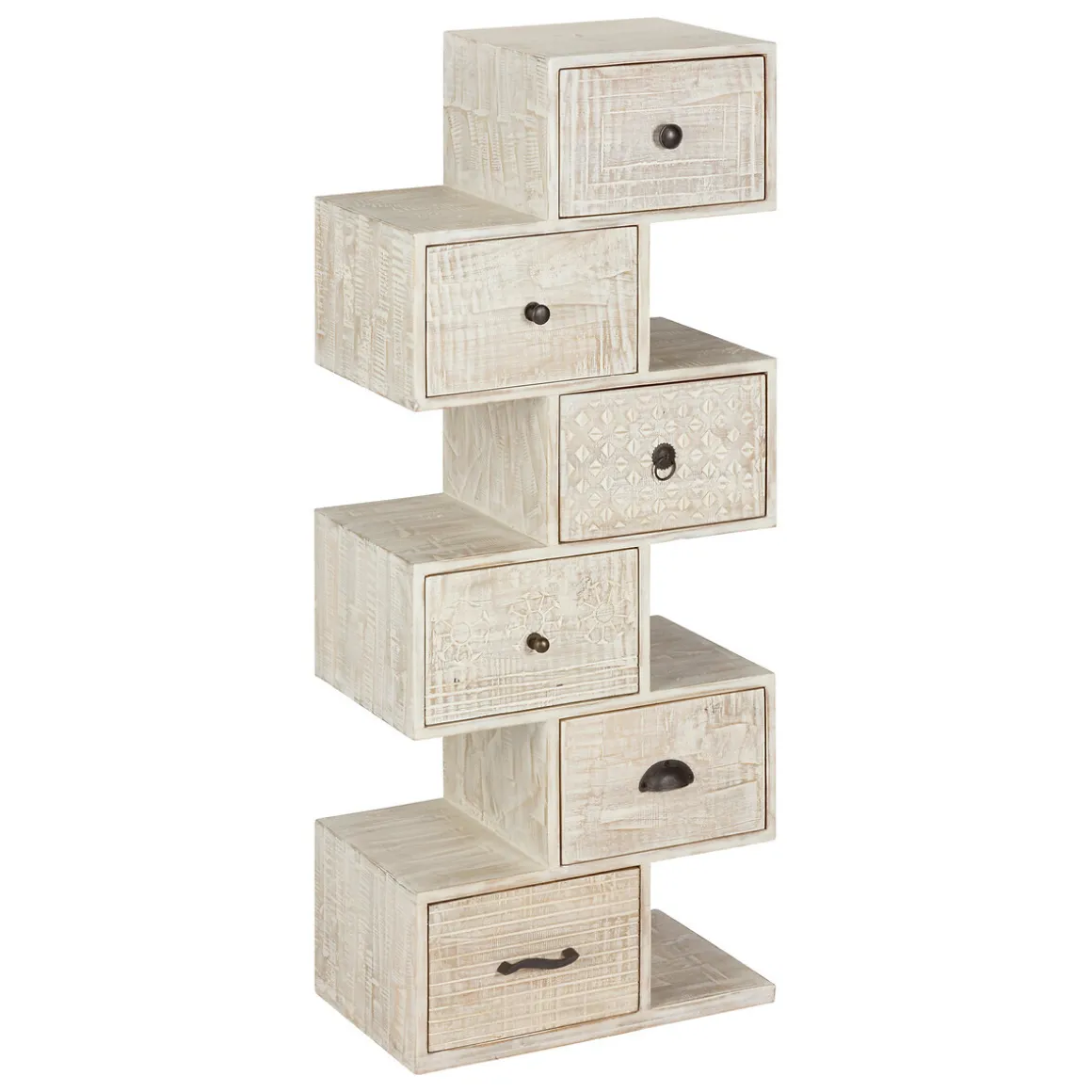 En bois sculpté à la main en Inde, son originalité réside dans son design : six tiroirs disposés de façon asymétrique les uns sur les autres, avec des poignées différentes pour chacun.