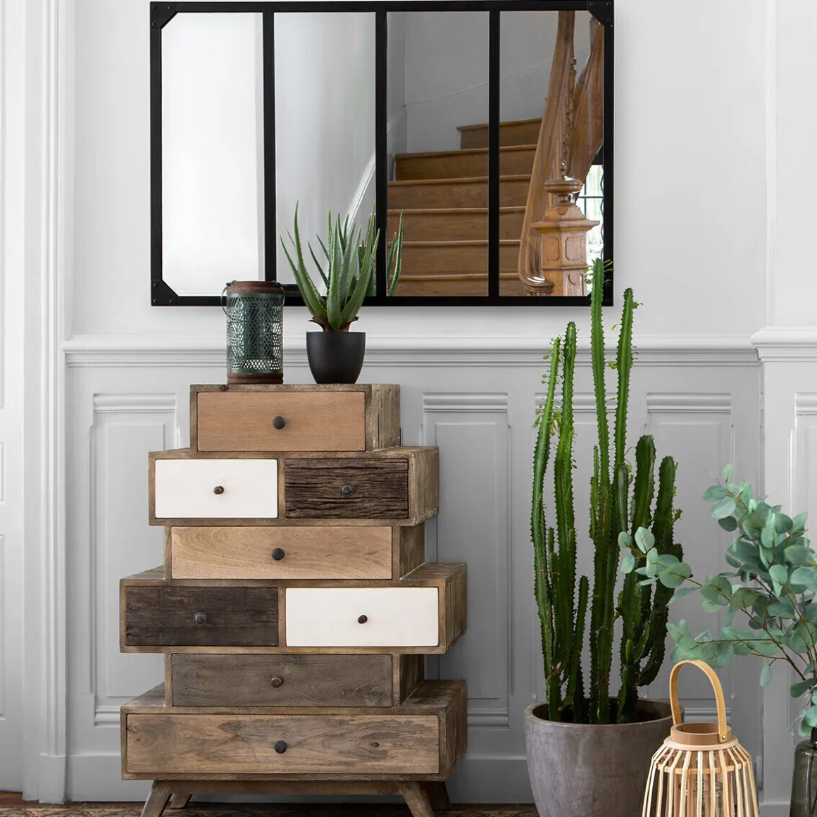 À la manière d’une verrière, le miroir en métal « Lola » habille votre mur de ses quatre pans. Résolument design, il confèrera une atmosphère industrielle à votre pièce.