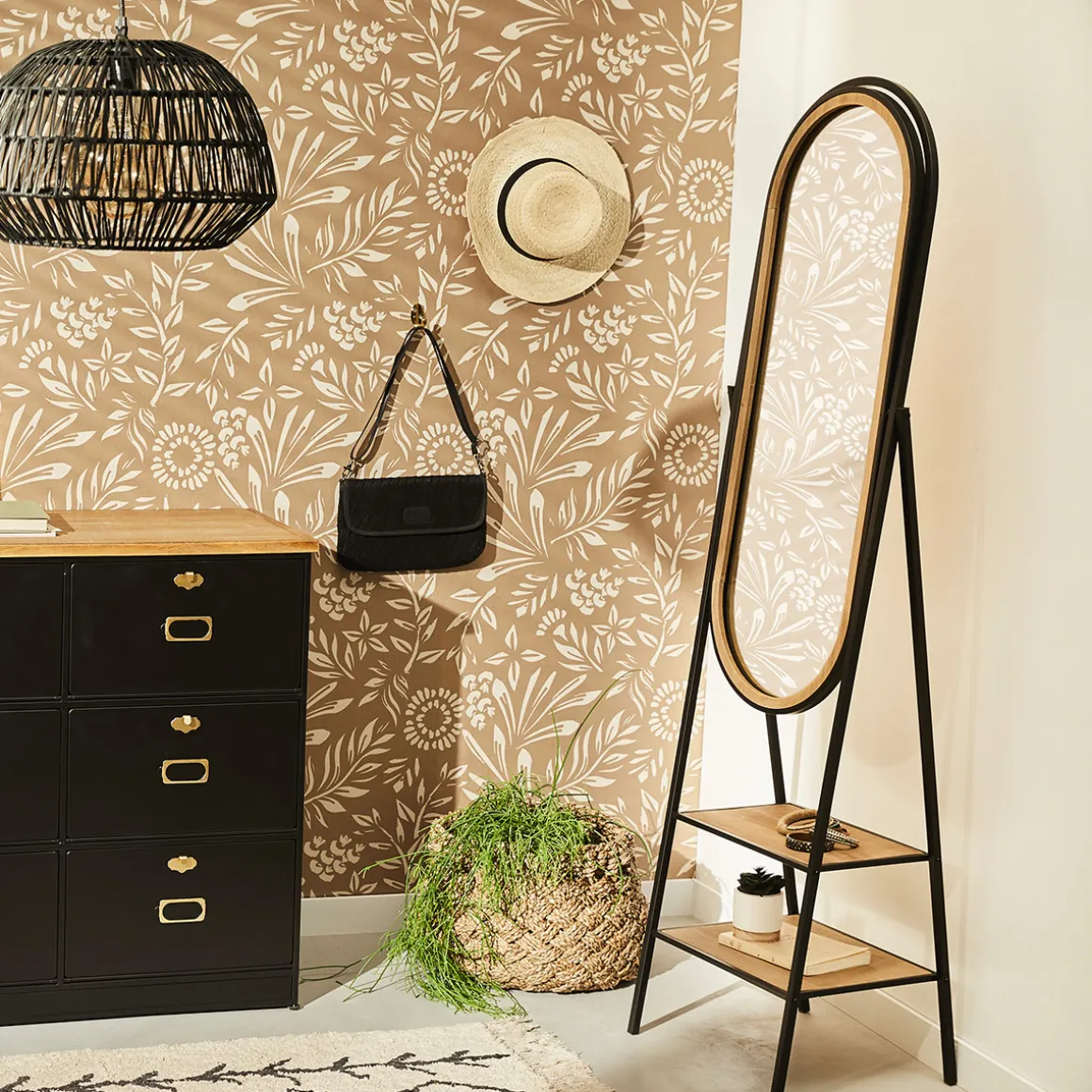Pour créer une ambiance loft, associez ce miroir sur pied « Maël » avec une commode ou une coiffeuse en bois patiné Atmosphera.
