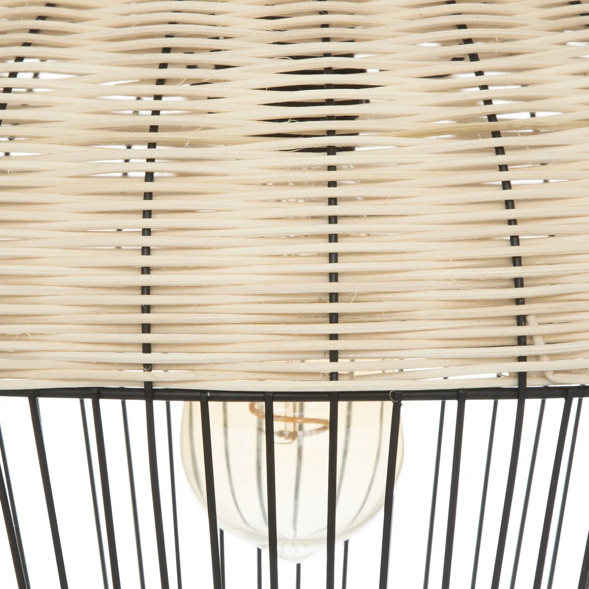 De format harmonieux, la suspension « Anea » est composée d’un abat-jour cage en métal, en forme de poire inversée. La partie supérieure est tressée de tiges de rotin dans un ton contrasté.