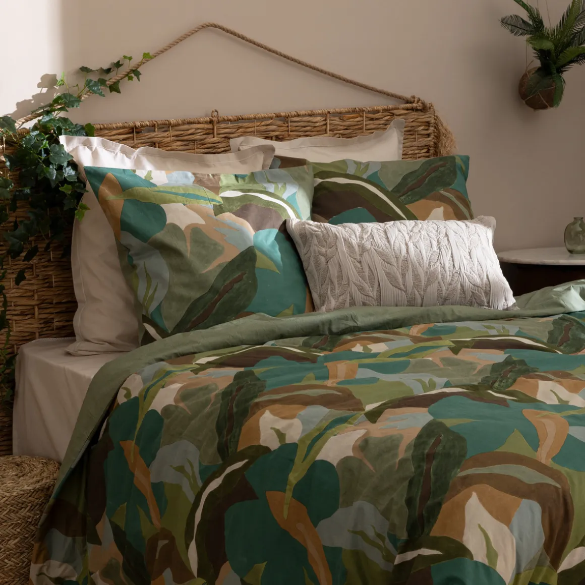 Accrochez votre tête de lit « Ori » et choisissez une housse de couette en lin lavé Atmosphera.