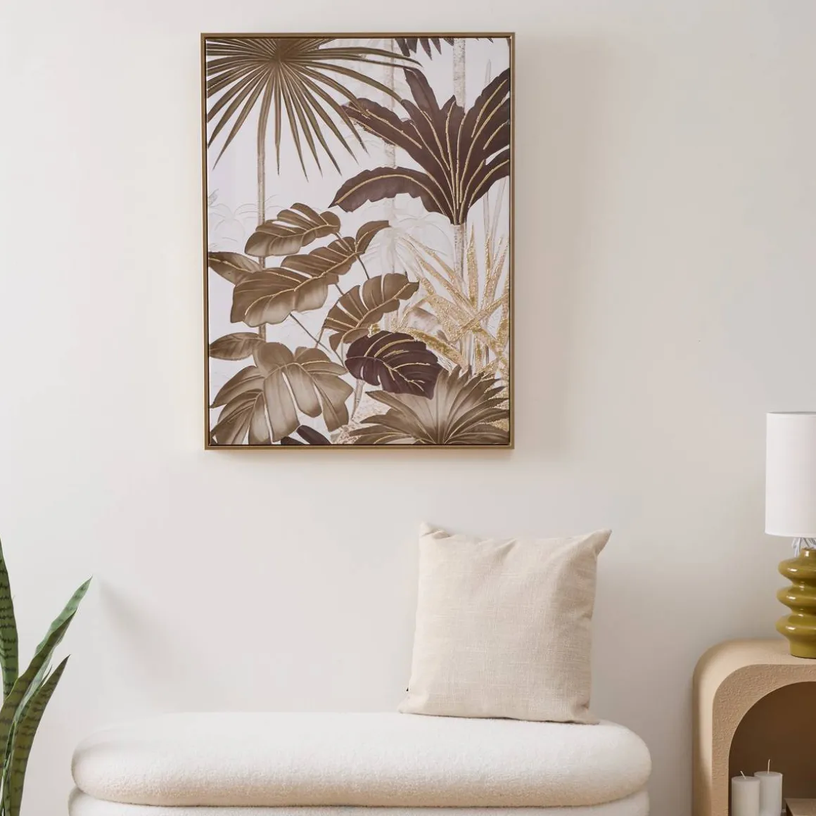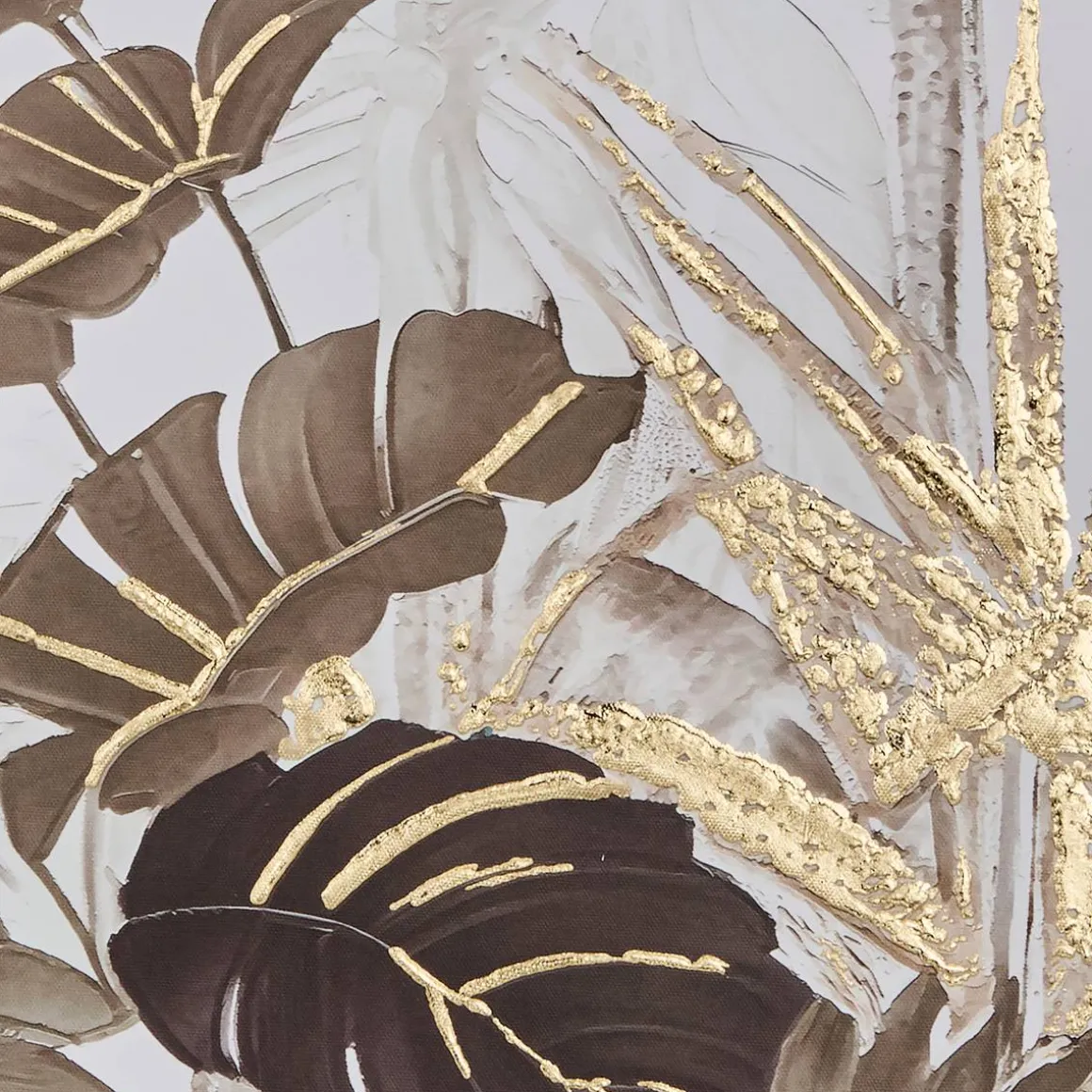 Les motifs végétaux de la toile sont représentés dans des couleurs neutres mais réhaussées d’une impression dorée en relief. Elle est montée dans un cadre en bois certifié FSC®. La toile en relief Shirley ira parfaitement au-dessus d’un meuble agrémenté de statuettes dorées Atmosphera.