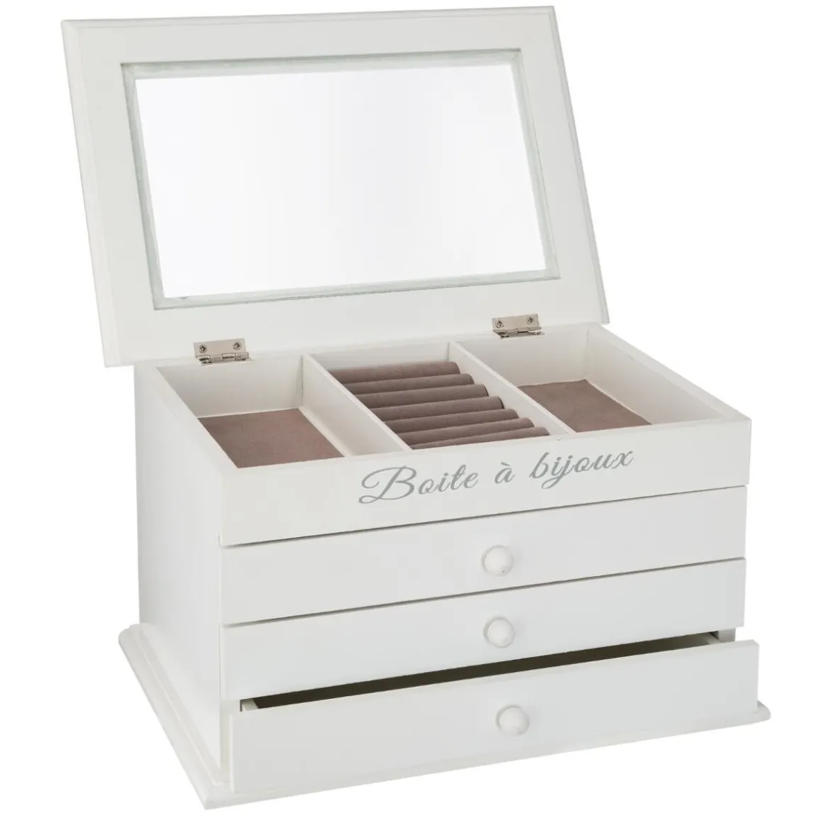 Réalisée en bois peint, cette délicate boîte à bijoux est aussi utile que décorative. Le couvercle ajouré par une partie en verre découvre plusieurs compartiments et un emplacement pour bagues. Avec sa forme de petite commode, elle dispose de 3 tiroirs et offre des lignes douces.