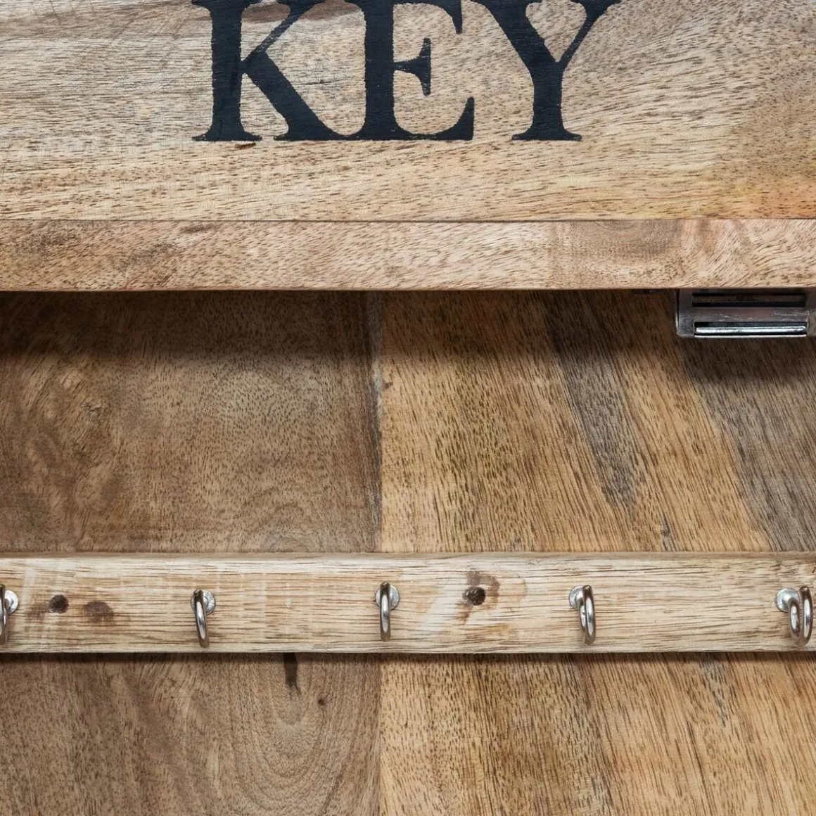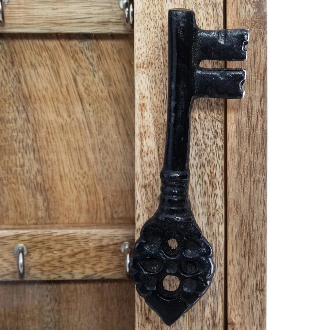 En bois de manguier veiné, cette boîte à clés est surmontée d’un fronton portant les mots Keys et Amalia 1361. Fermée par une porte transparente aimantée à la poignée en forme de clé, elle dispose de 8 crochets.