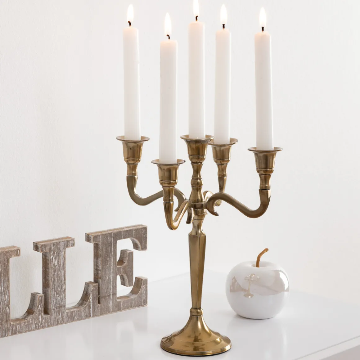 Pour une ambiance chaleureuse lors d’un repas, posez le bougeoir 5 têtes simplement au centre d’une table à manger Atmosphera.