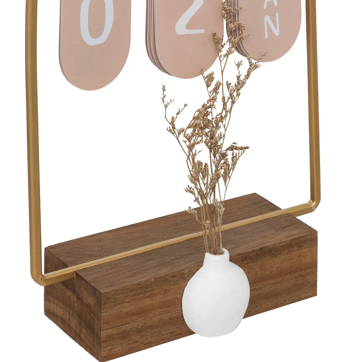 Réalisé à partir d’une structure en métal doré, montée sur un socle en bois chaleureux, le calendrier « The floral » est perpétuel grâce à ses anneaux retenant des patchs imprimés qui permettent d’ajuster la date du jour. Un petit soliflore garni de fleurs séchées ajoute une touche poétique et délicate à l’ensemble.
