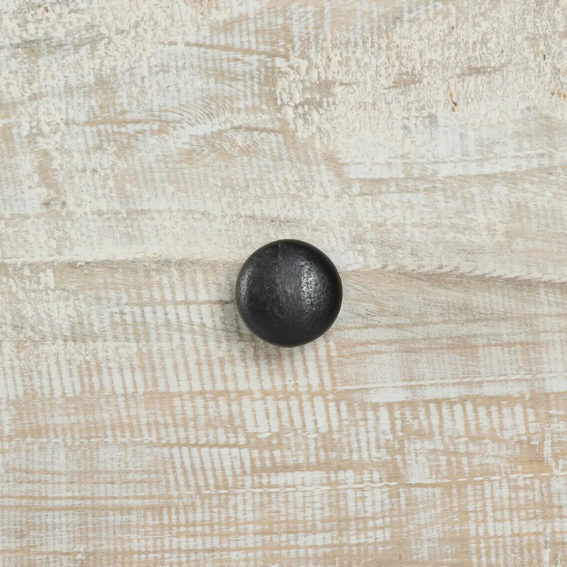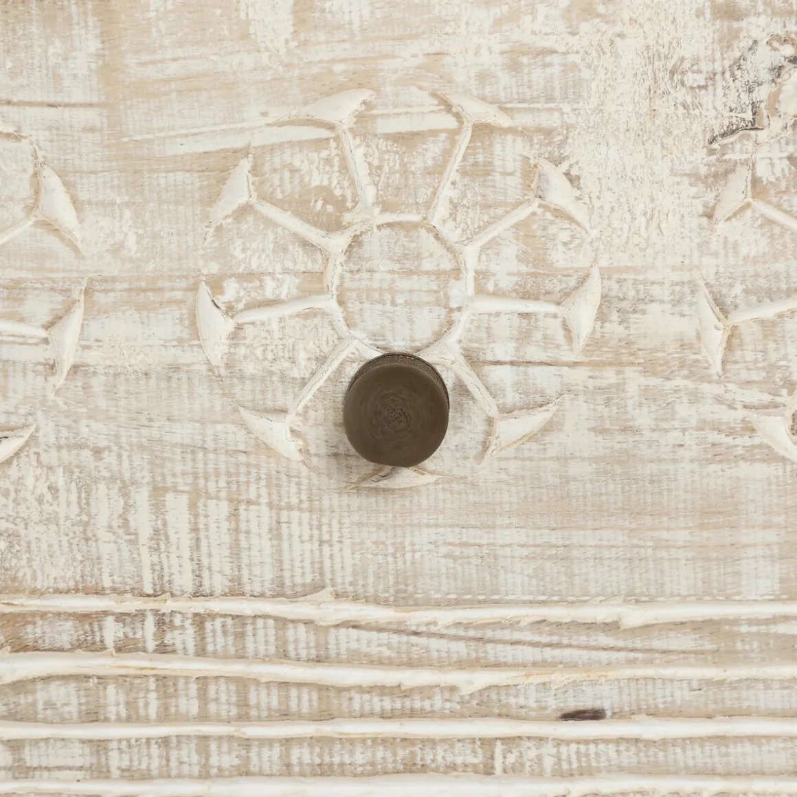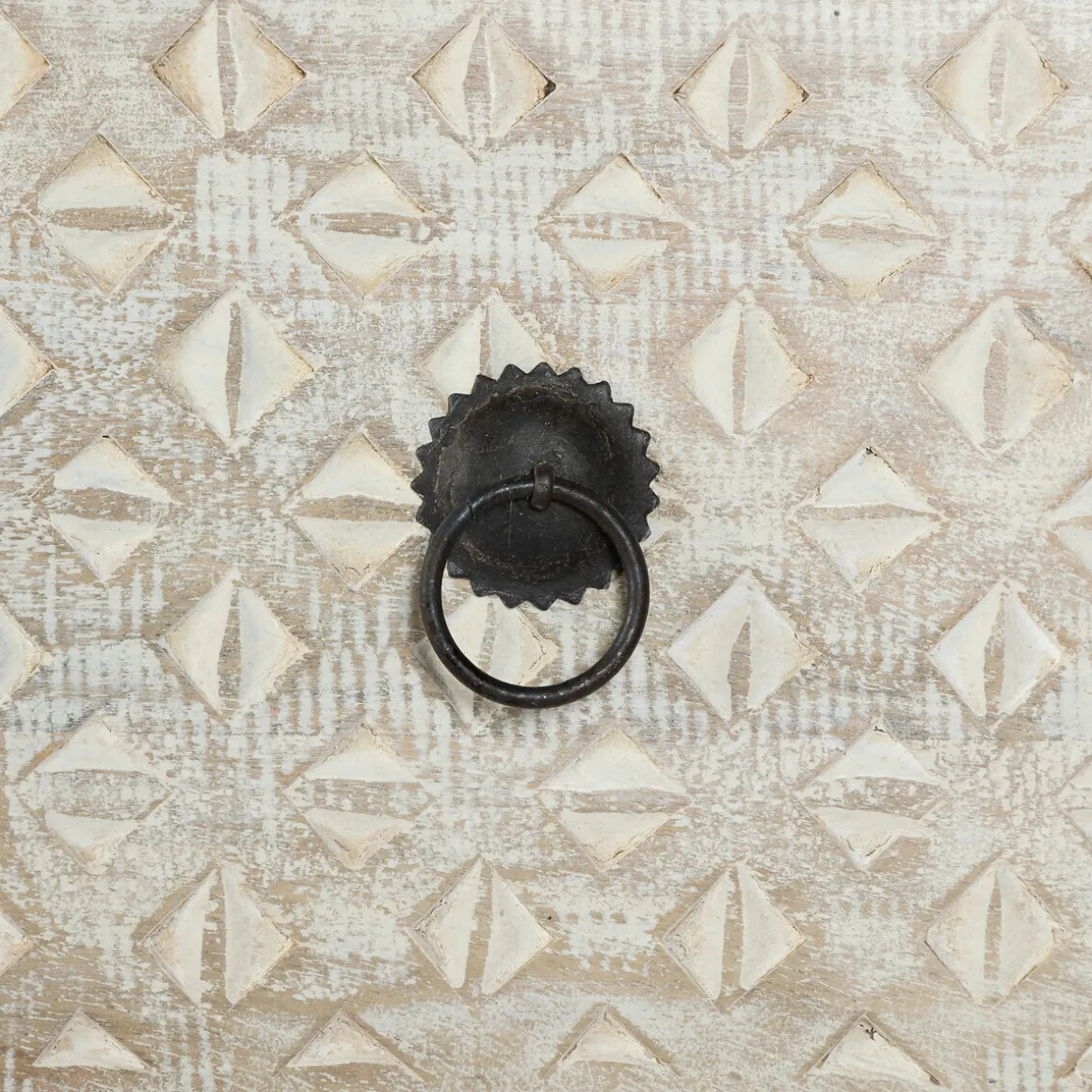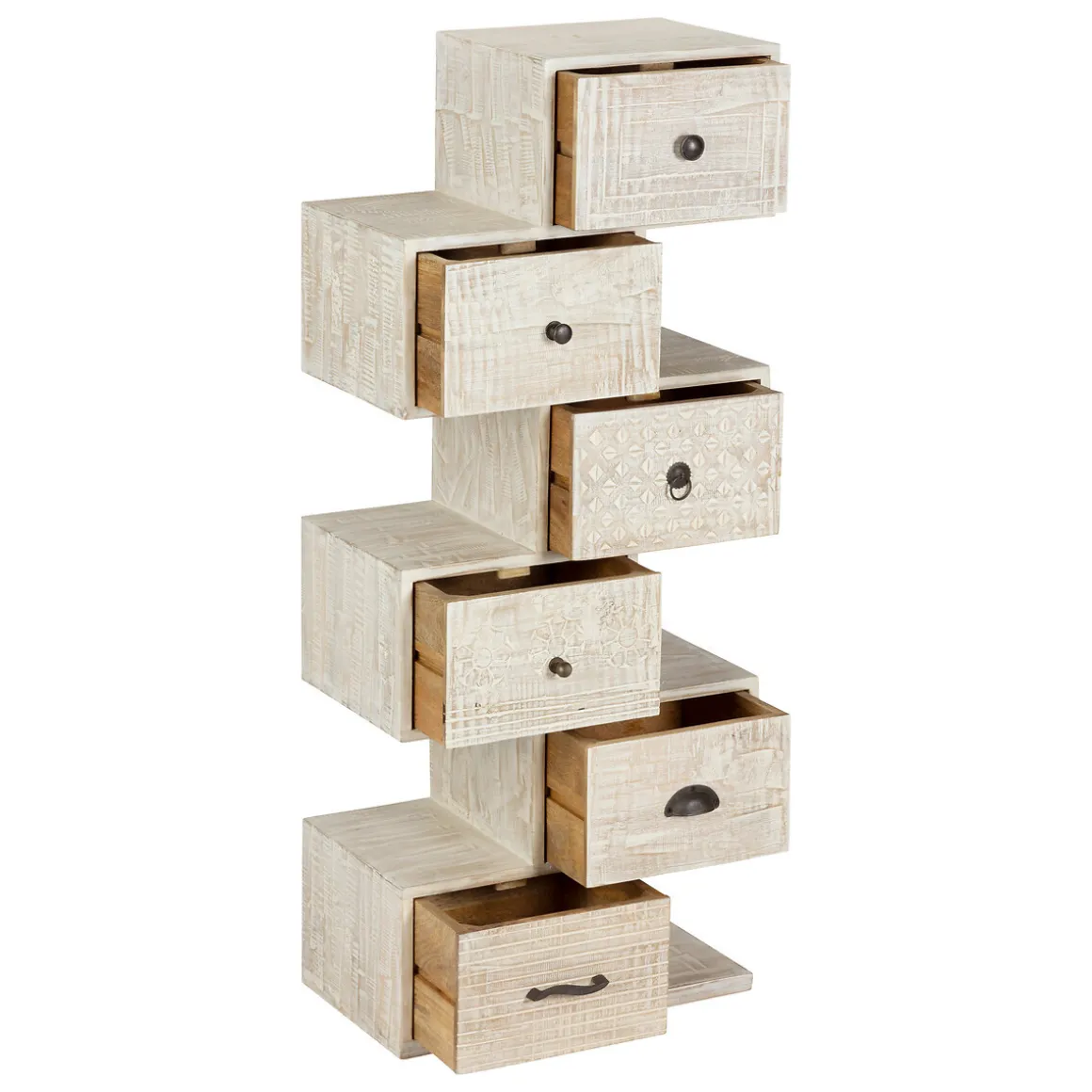 En bois sculpté à la main en Inde, son originalité réside dans son design : six tiroirs disposés de façon asymétrique les uns sur les autres, avec des poignées différentes pour chacun.