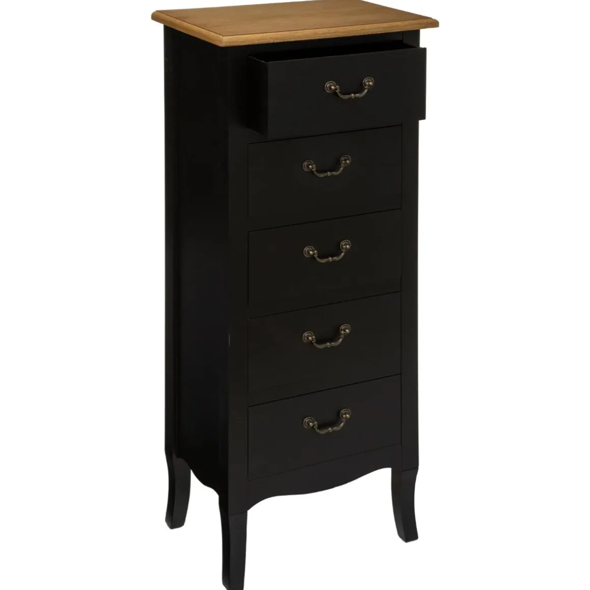 Doté de cinq tiroirs, le chiffonnier « Chrysa » se plaira dans votre chambre, un coin de votre salon, votre entrée ou un couloir.