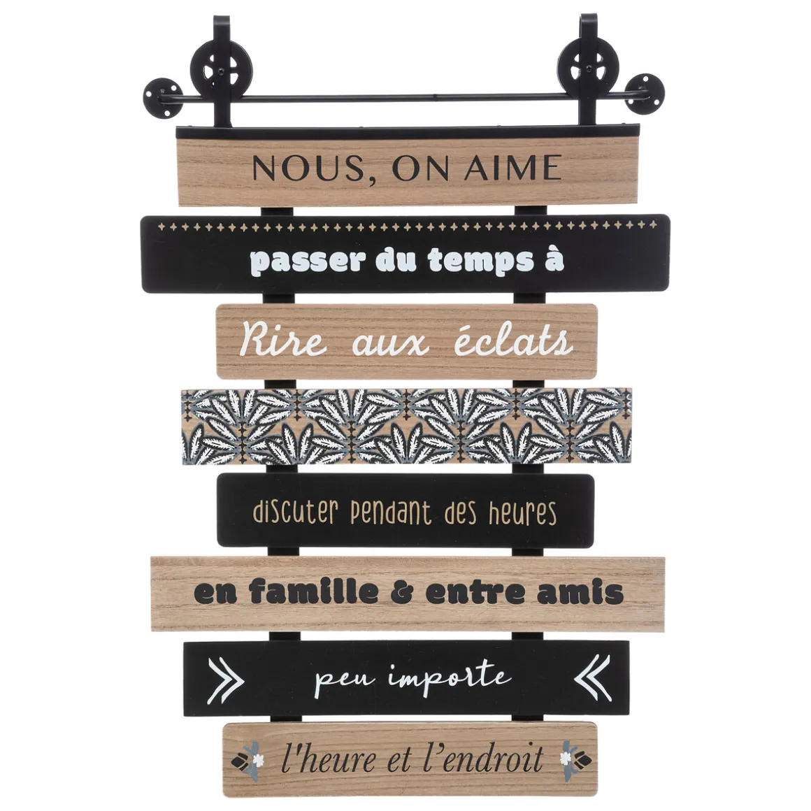 Réalisée en bois, la déco murale « Jim » est constituée d’une série de panneaux superposés et assemblés sur une structure en métal d’esprit néo industriel. Peintes dans des coloris différents et ornées de motifs, les planches sont porteuses d’un message convivial et chaleureux.