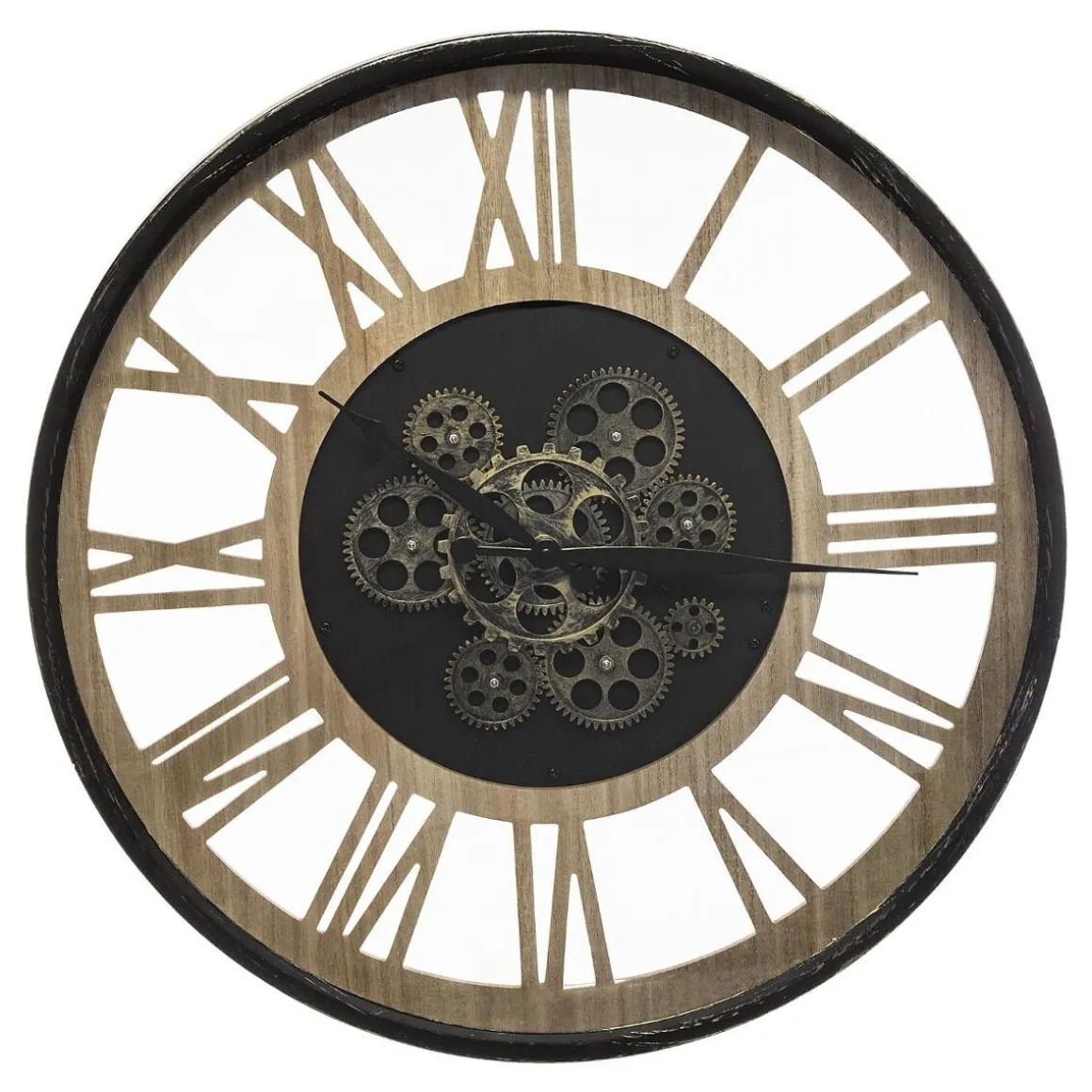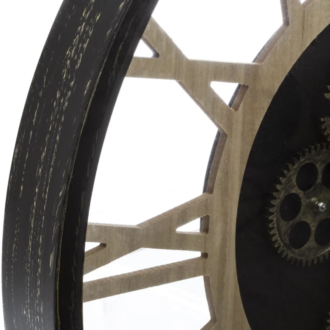 L’horloge est composée d’une face en fibres de bois entourée d’un cadre en fer. Vous succomberez au mécanisme apparent de cette horloge à l’allure rétro. Il reste en mouvement grâce à 2 piles AA, qui permettent de faire tourner les rouages.