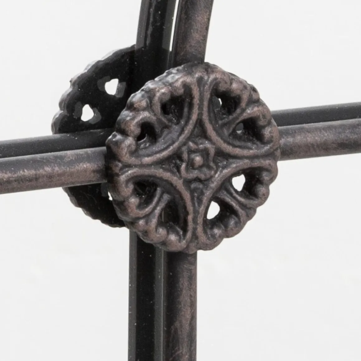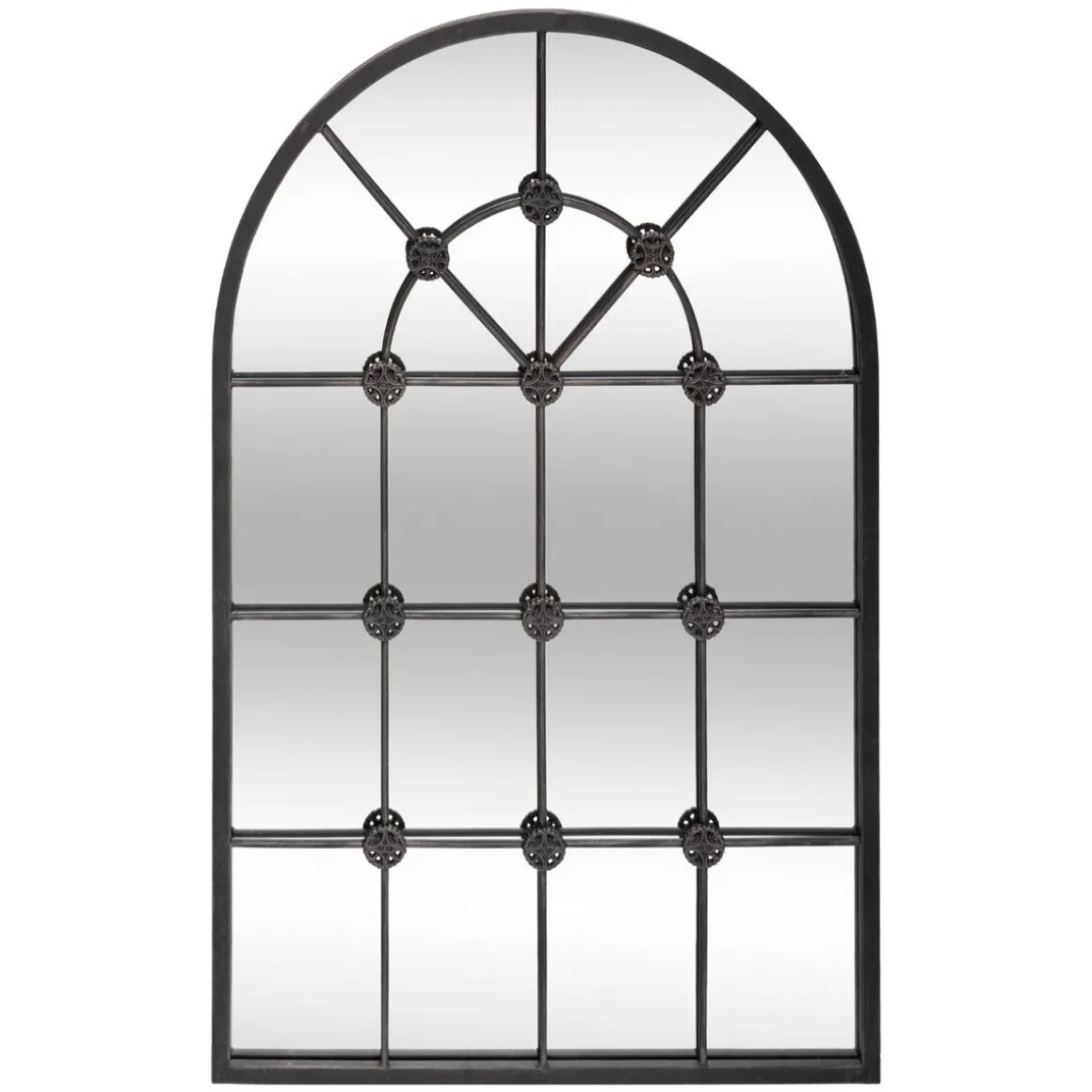 Divisé en carreaux par une structure en fer ornée de rosettes ouvragées, ce grand miroir vertical imite une verrière avec sa forme arrondie au sommet. Tel une fenêtre supplémentaire, il captera la lumière pour éclairer votre chambre ou votre séjour.