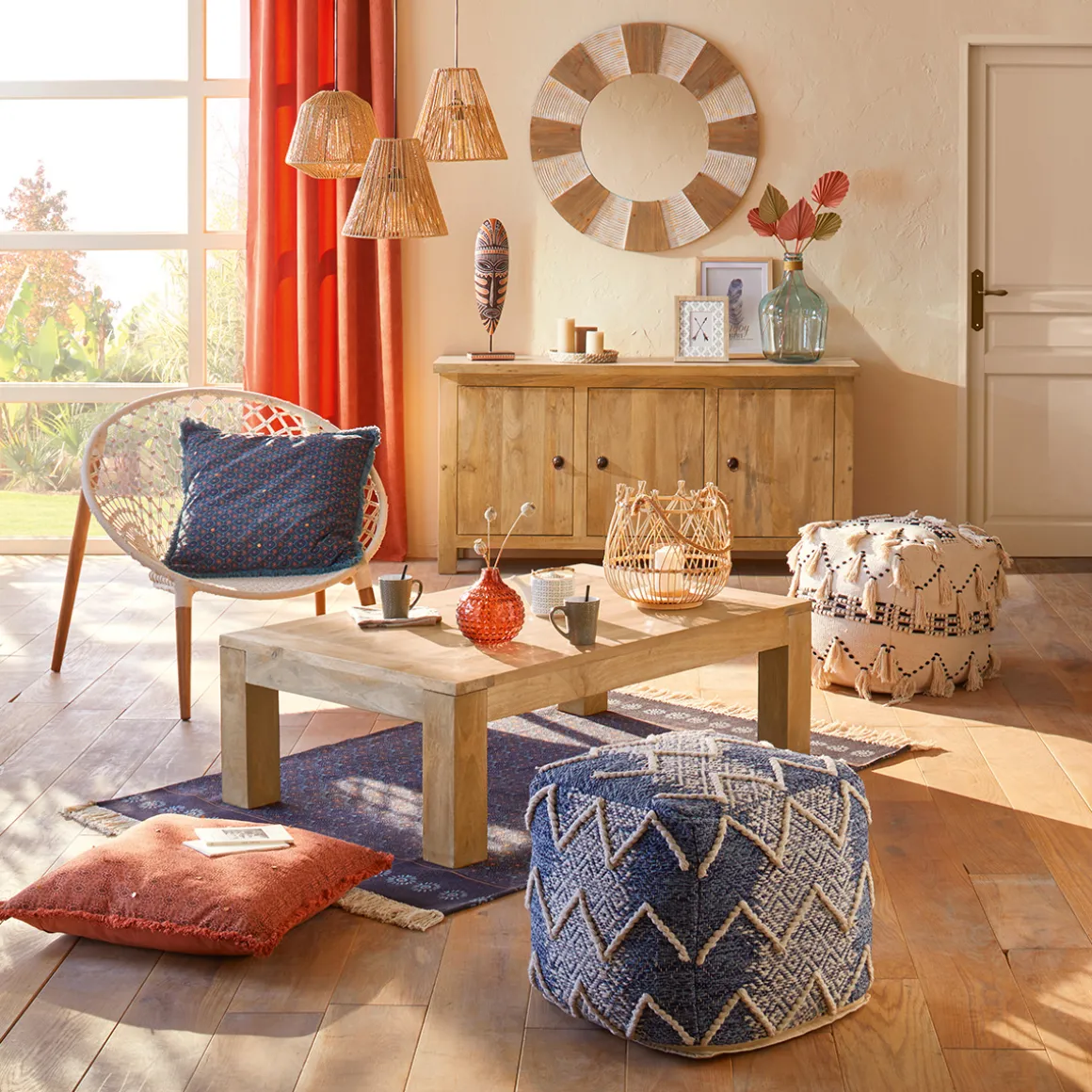 Déposez des coussins de style berbère au pied du miroir pour une ambiance aux influences d’autres contrées.