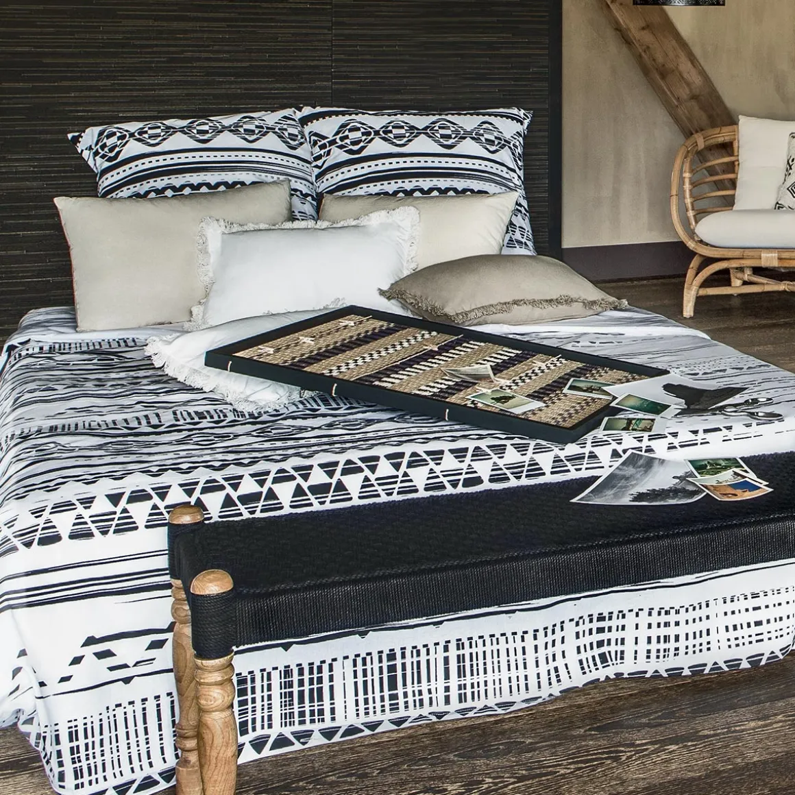 La parure de lit « Etnik » est imprimée de motifs graphiques qui invitent au voyage. En coton, elle comprend une housse de couette deux personnes fermée par des boutons invisibles et 2 taies d’oreiller carrées.