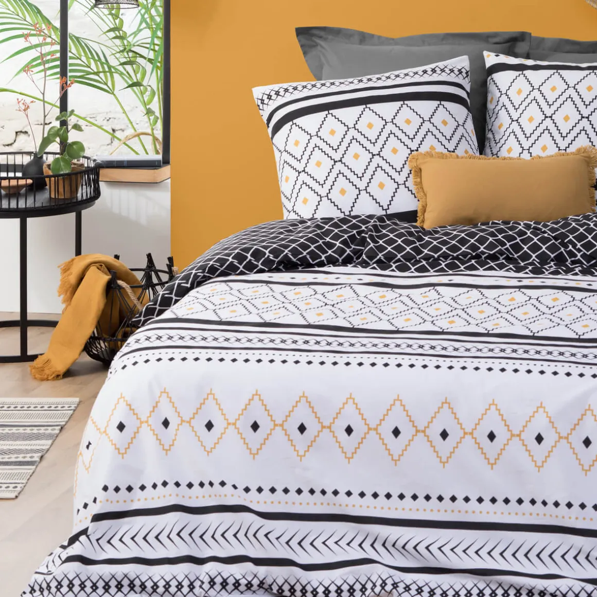 La parure de lit « Etniss » est composée d’une housse de couette 2 personnes et de 2 taies carrées. Imprimée de motifs graphiques très raffinés de chaque côté, elle joue sur un style élégant et féminin.