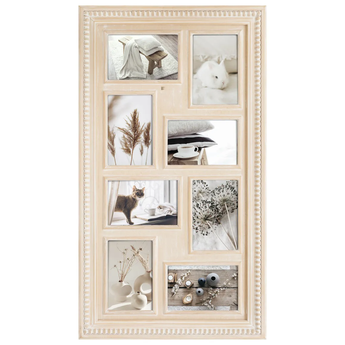Très authentique, le pêle-mêle « Elena » est réalisé en bois de pin, le cadre travaillé offrant des moulures et reliefs délicats. L’intérieur comporte 8 cadres vitrés qui vous permettront de placer vos photos aux formats paysage et portrait. Romantique, il accueillera volontiers de photos en noir et blanc.