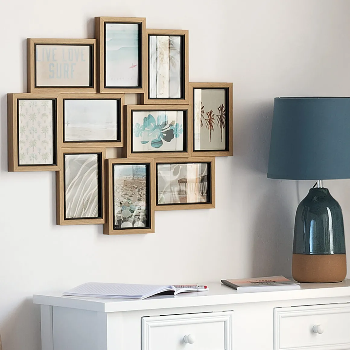 Les dix cadres assemblés au sein de ce pêle-mêle « Kyle » ont été agencés de manière irrégulière. Vous pourrez l’accrocher dans les deux sens, vertical ou horizontal. L’alliance des lignes contemporaines et de la matière façon bois facilitera l’intégration de ce modèle dans un intérieur moderne ou vintage.