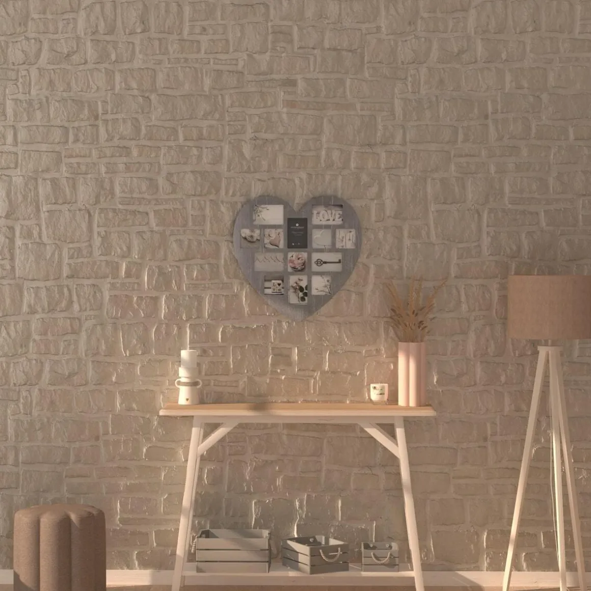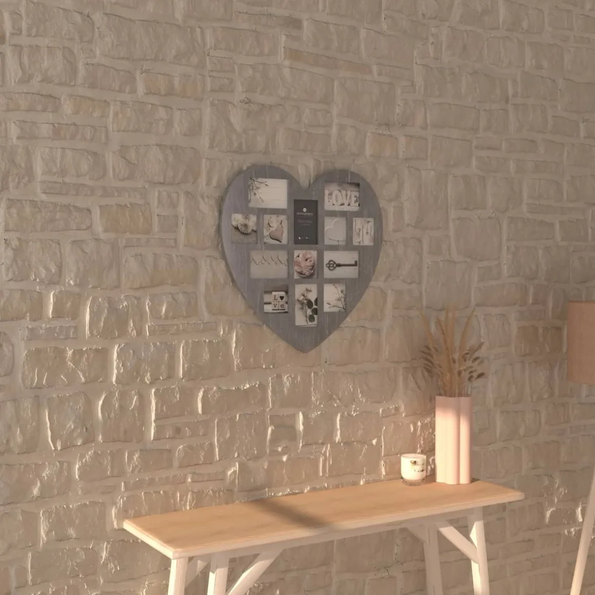 Idéal pour exposer une sélection de vos photos ou cartes préférées, ce pêle-mêle « Patine » en forme de coeur est réalisé en bois à l’aspect cérusé. Disponible dans deux teintes douces, il vous permettra de disposer 13 photos dans des cadres en verre de tailles et formes différentes. Ce pêle-mêle poétique trouvera sa place au-dessus d’une commode ou d’une tête de lit.