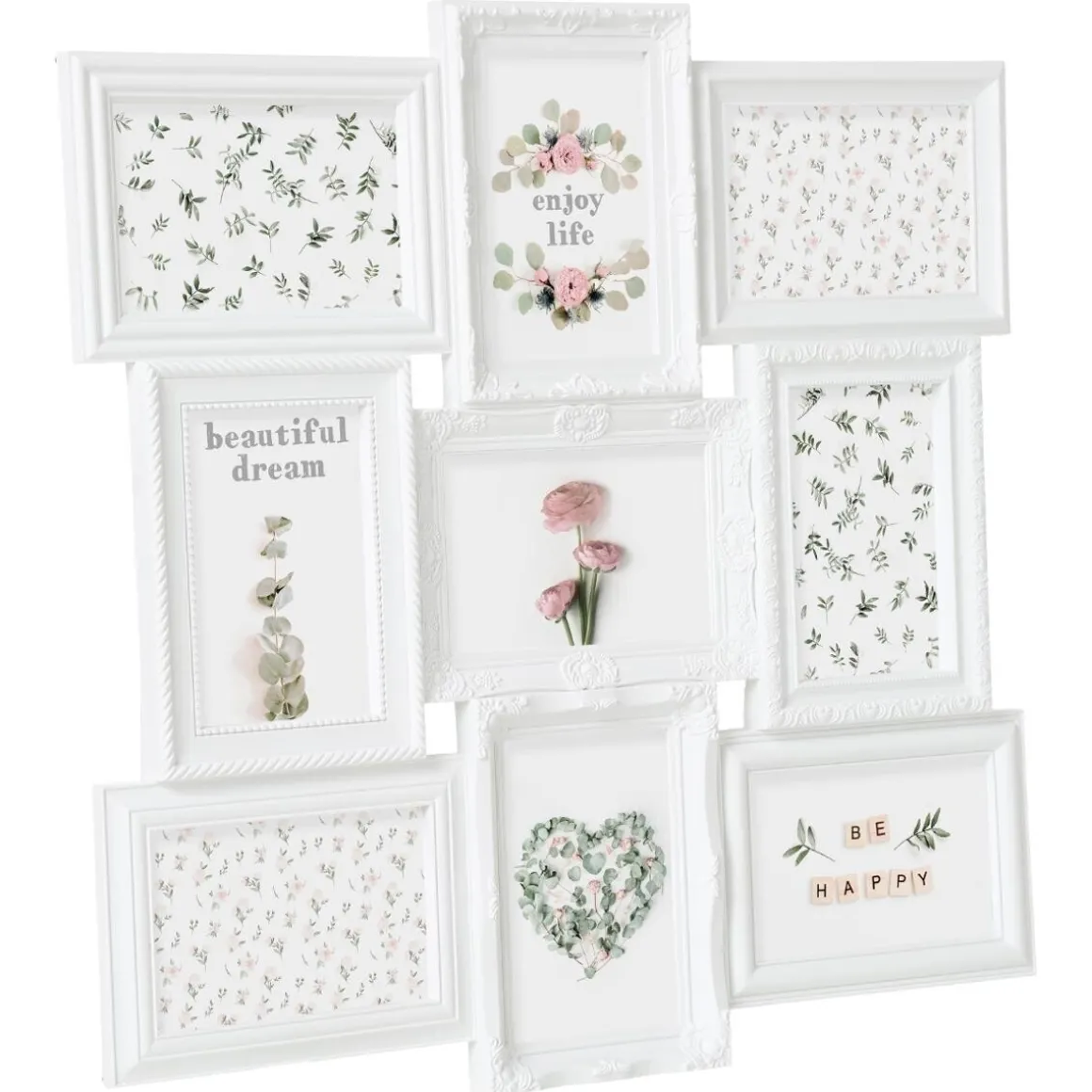 Composé de 9 cadres vitrés et enchevêtrés les uns dans les autres, ce grand pêle-mêle « suzy » accueillera votre sélection de photos aux formats paysage et portrait. Avec des contours à moulures ou semés de fleurs, ces cadres apporteront une touche bucolique dans votre déco.