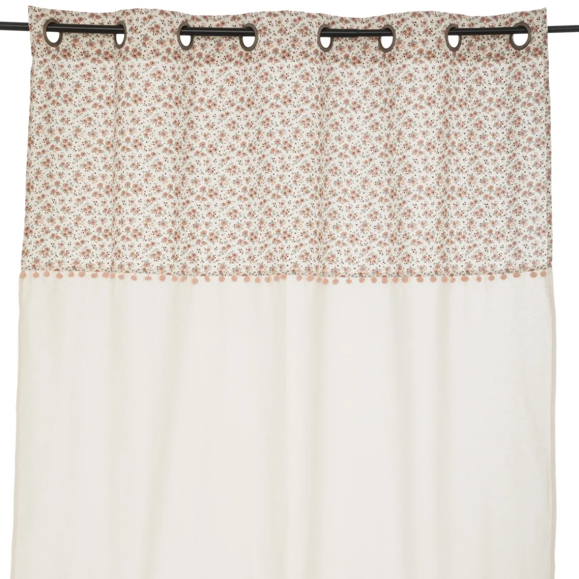 Ce rideau est réalisé dans un voile de coton uni et il est rehaussé d’une large bande de coton imprimé de motifs fleuris dans la partie supérieure. Vous pourrez le glisser facilement sur une tringle grâce à des oeillets métalliques et le laver en machine. Idéal pour apporter de l’intimité dans une chambre, il obéit à des dimensions standards.