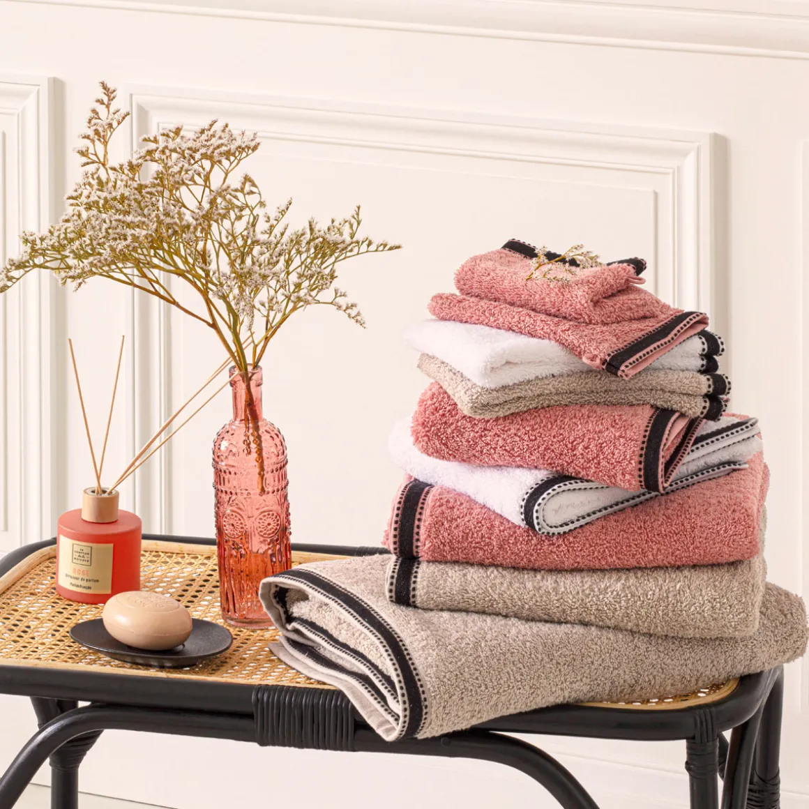 En coton éponge, elle offre un toucher doux et une excellente capacité d’absorption. Son design sobre est rehaussé par une bordure brodée contrastée. Entretien en machine à 60 degrés.
