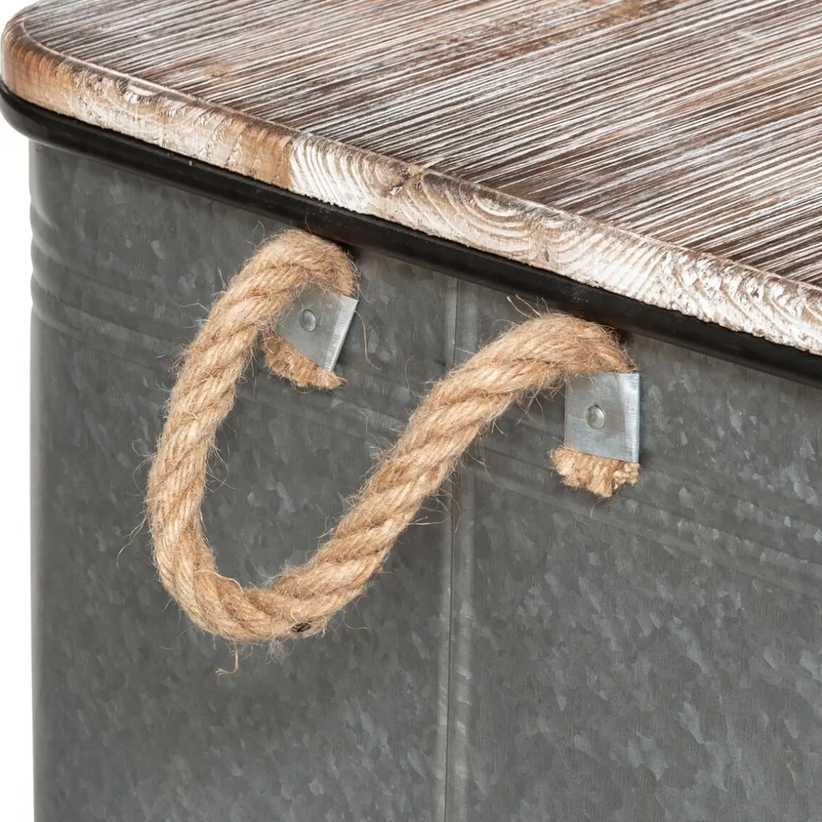 Ces malles en zinc sont munies d’un couvercle en bois patiné pour un rendu authentique. Des inscriptions contrastées inspirées d’anciens éléments de stockage ornent leur façade. Des poignées en corde sont fixées sur les côtés pour les déplacer facilement.