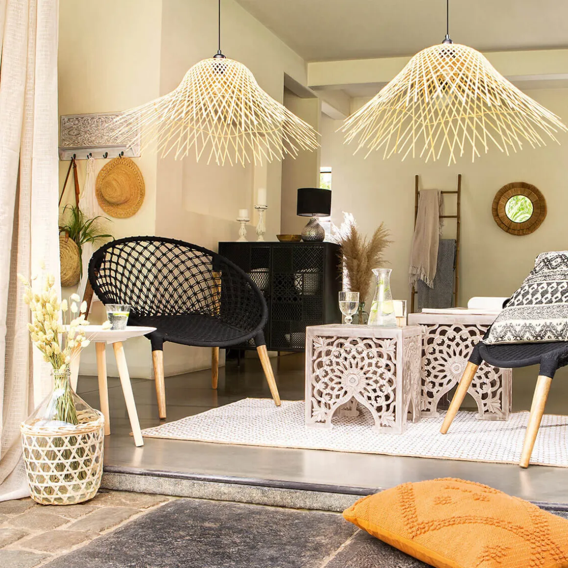 Suspendez ce luminaire au-dessus d’une table Atmosphera en bois sculptée pour transporter vos convives à l’autre bout du monde.