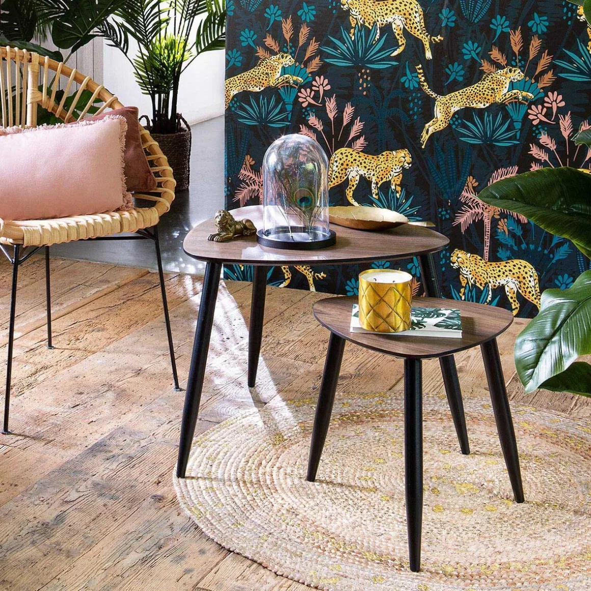 Ces deux tables à café gigognes façon noyer se distinguent par leur silhouette bicolore. Les pieds compas réalisés en bois de peuplier rehaussent avec raffinement le plateau doté d’un placage en noyer.